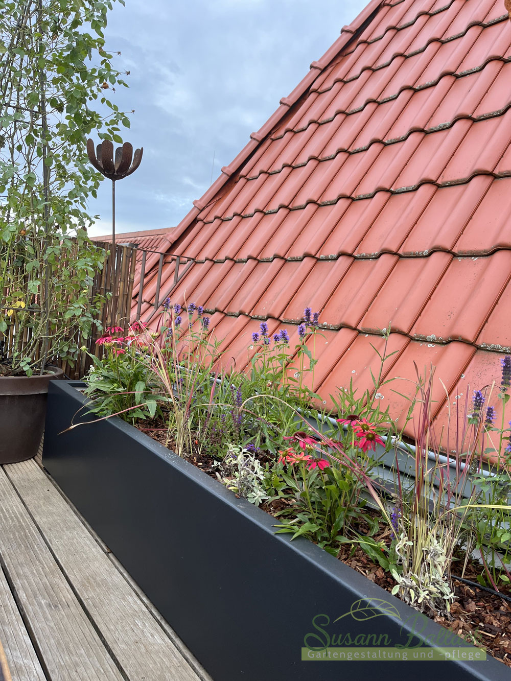 sich verändernder Prioritäten im Leben, bat uns die Familie, sie auch in diesem Projekt zu begleiten. Man zog in eine größere Maisonettewohnung mit großer Dachterrasse. Der bestehende Holzbelag wurde gereinigt und die alten Gefäße und Pflanzen entfernt. Wichtig war es, einen Teil des bestehenden Mobiliars auf der Terrasse zu integrieren, sowie das geliebte Gartenbild mit dessen Bepflanzung aufzugreifen.